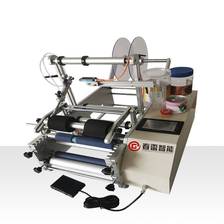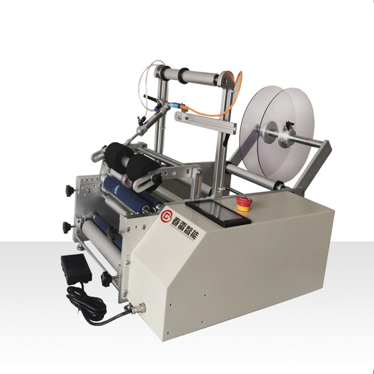 Semi-automatic round bottle labeling machine (including display screen) is a semi-automatic labeling machine, suitable for labeling various specifications of cylindrical objects, small taper round bottle labeling, such as xylitol, cosmetic round bottles, wine bottles, etc. Optional ribbon printer and inkjet printer, labeling and printing production batch number and other information at the same time, reduce packaging procedures and improve production efficiency.